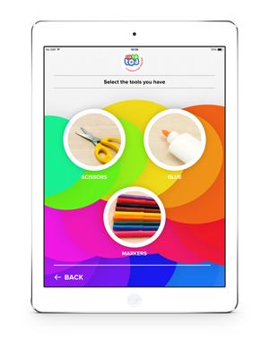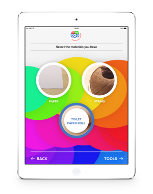 TutoTod user, within the application, selects the materials and the tools that she or he has available at home. Based on those materials, the App offers ideas that can be immediately put into action, as well as the detailed steps that lead through the process.